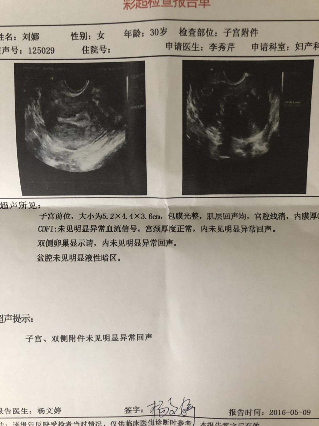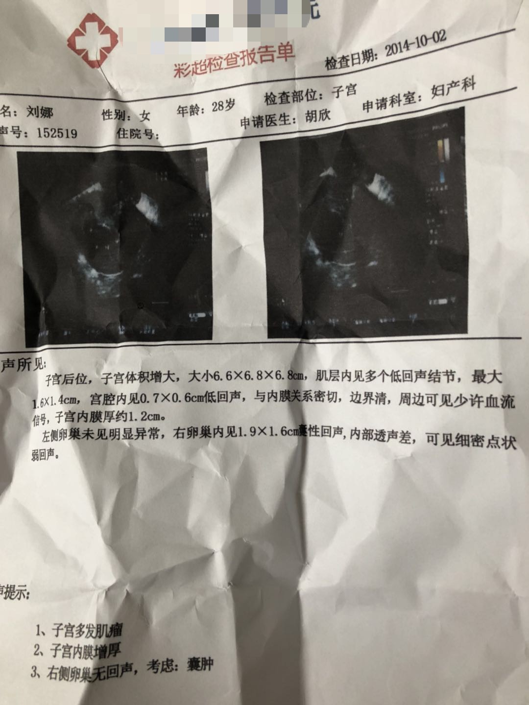 然是两个,一个0.7cm,一个是1.6cm,我看到这个结果几乎要晕过去,在想是不是检查报告单打错了,因为我除了月经有点不规律之外,那些尿频呀、坠